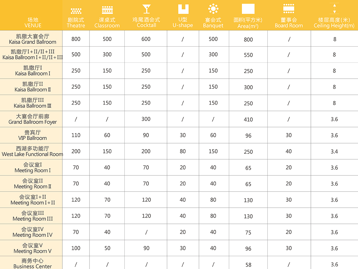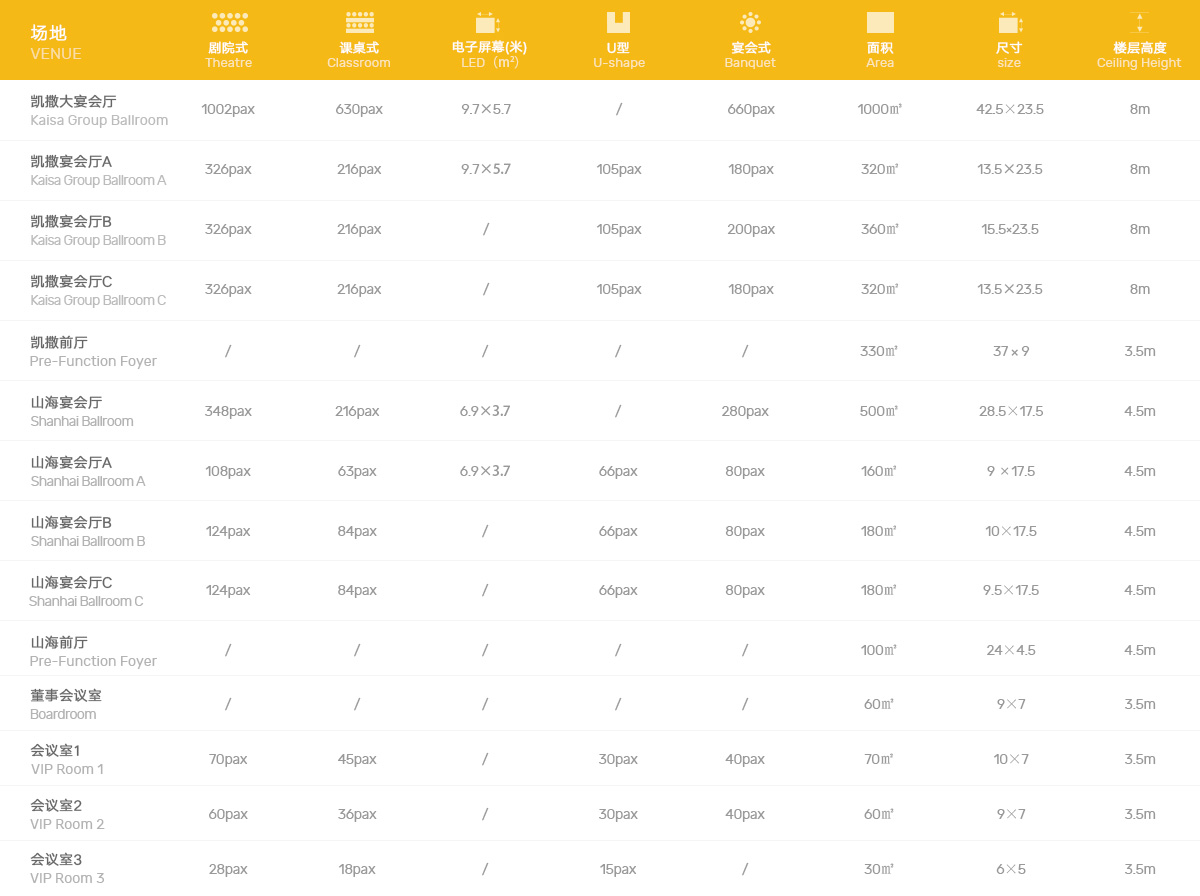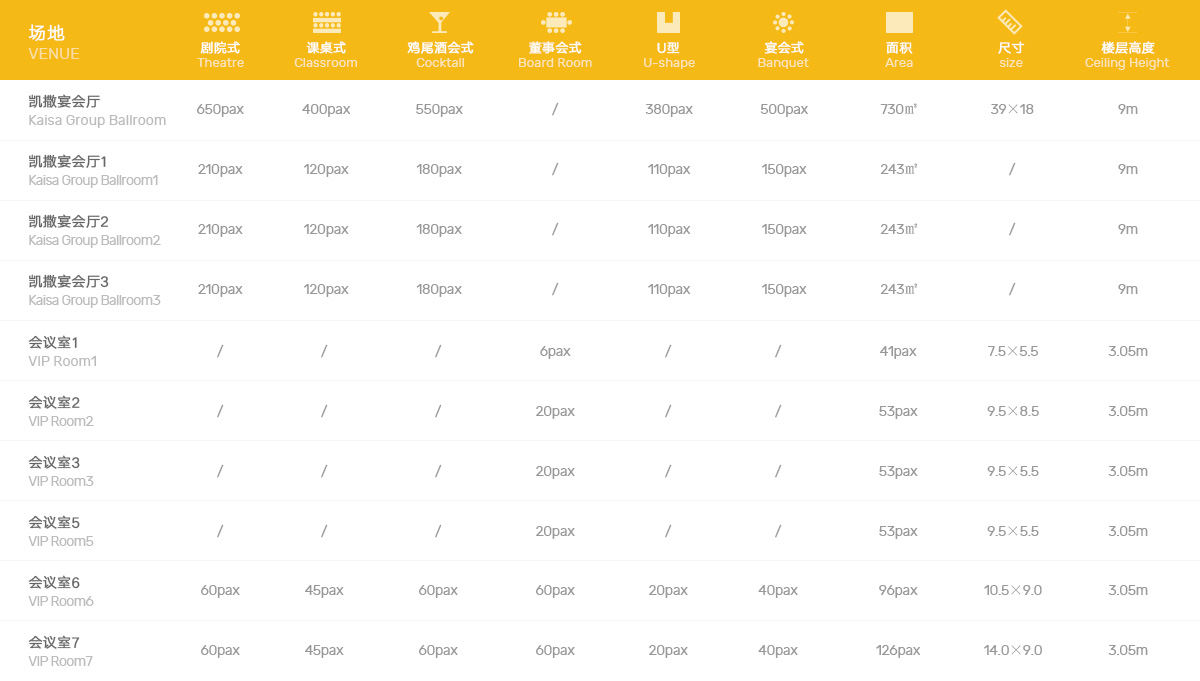 酒店擁有面積逾3,000平米的室內和戶外會議及宴會區域,配有先進的會議設施設備;1,000平方米無柱凱撒大宴會廳位于酒店1層,層高8米,可分隔成三個獨立宴會廳;可直接駛入豪華轎車供會議及宴會使用,并配有56平方米內嵌式高清LED屏幕及投影儀;330平米的寬敞大宴會廳前廳可盡覽壯闊海景;500平米的山海宴會廳也可分隔成三個小宴會廳供使用,配有26平方米內嵌式高清LED屏幕及投影儀。